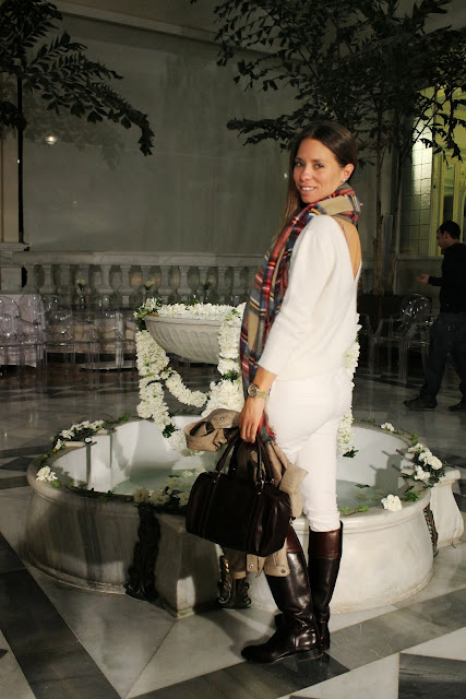 Look total black, con chaqueta de piel en rojo para darle un toque de color, y bufanda con estampado en pata de gallo ;-D